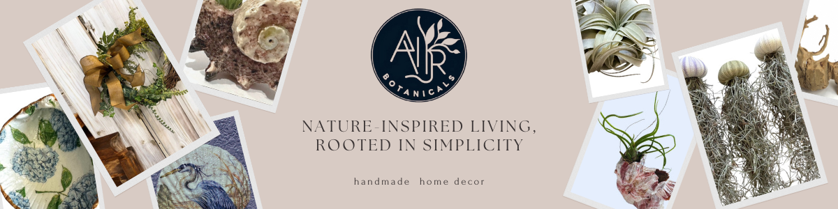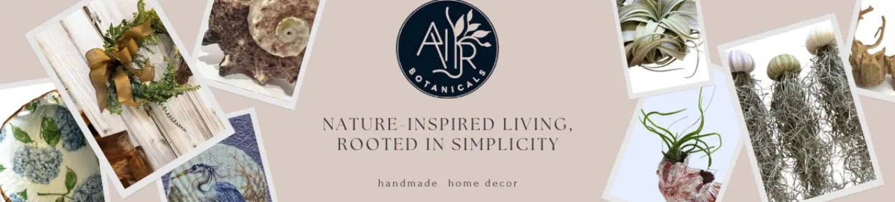 Our “botanical touch” began with air plants—our first love—and blossomed into a full craft shop inspired by nature’s forms, textures, and calming palette. We weave in organic motifs (hydrangeas, leaves, seagrass), coastal elements (shells, drift finds), and earthy finishes like jute and wood to create pieces that feel soft, grounded, and timeless. The result is décor that brings gentle garden-and-coast serenity into everyday spaces.