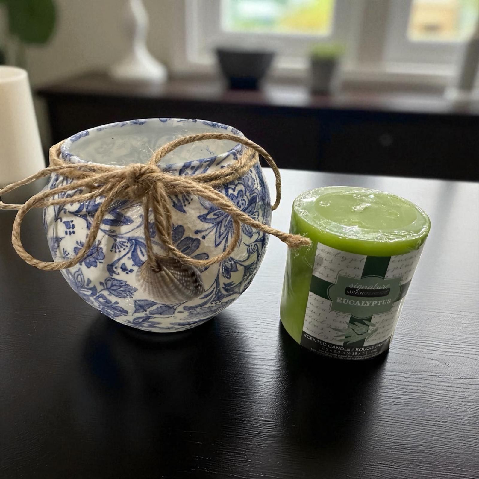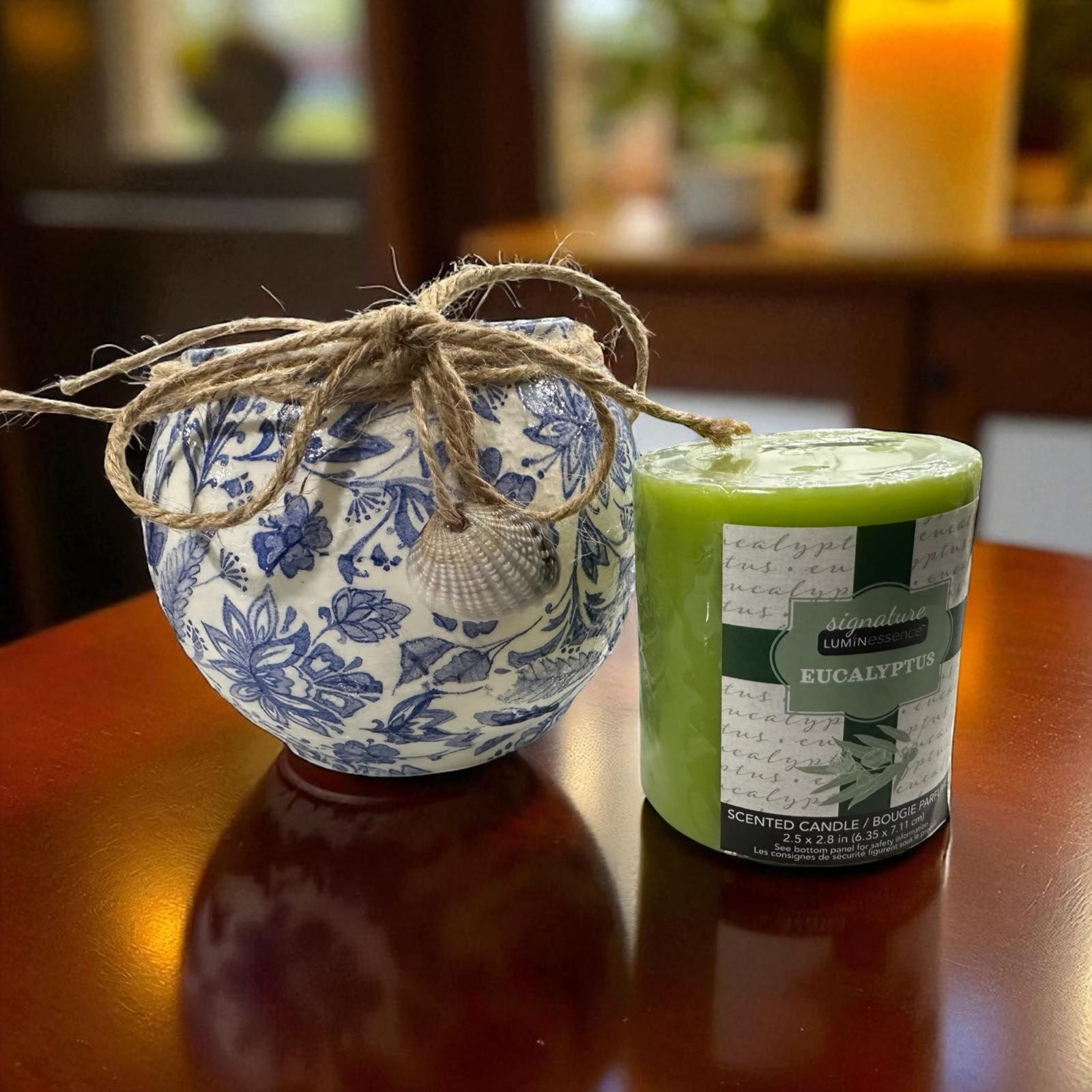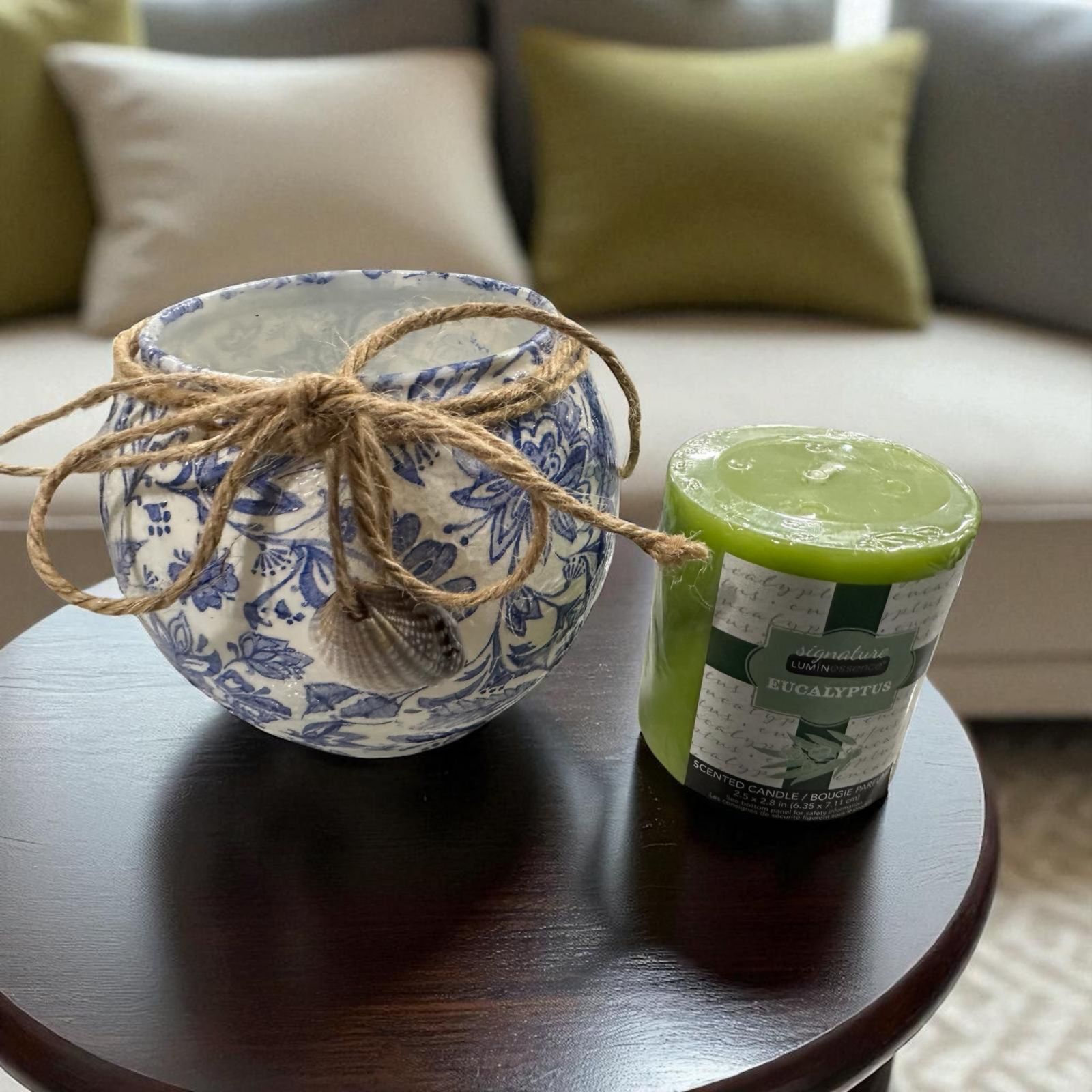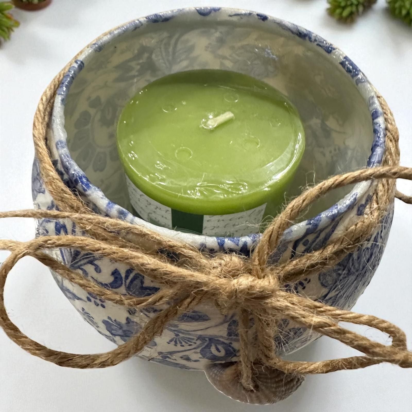 Bring timeless elegance to your space! This handmade glass decoupage candle holder features a delicate blue floral pattern, inspired by classic toile and chinoiserie designs. The smooth glass surface allows the intricate details to shine beautifully, while the soft glow of a candle inside creates a warm and inviting atmosphere. Finished with natural jute twine and a small seashell accent, it blends rustic charm with refined artistry.