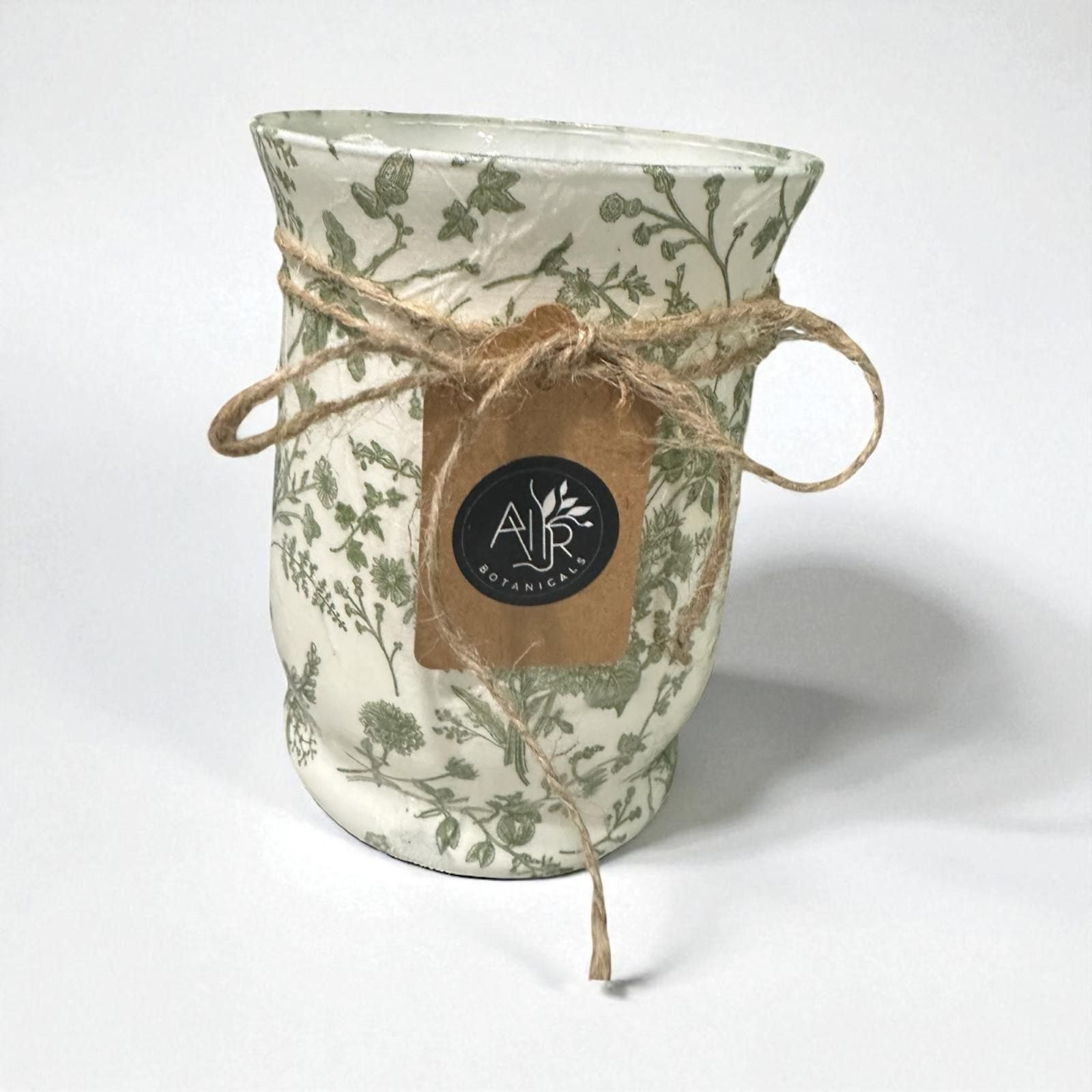 Bring botanical elegance to your space! These tall glass decoupage candle holders feature intricate floral designs in calming shades of blue or green, inspired by classic toile patterns. Their graceful silhouette and luminous glass surface allow candlelight to glow beautifully through the delicate prints, creating a warm and enchanting atmosphere. Finished with rustic jute twine and a kraft tag, they blend timeless artistry with a touch of natural charm.
