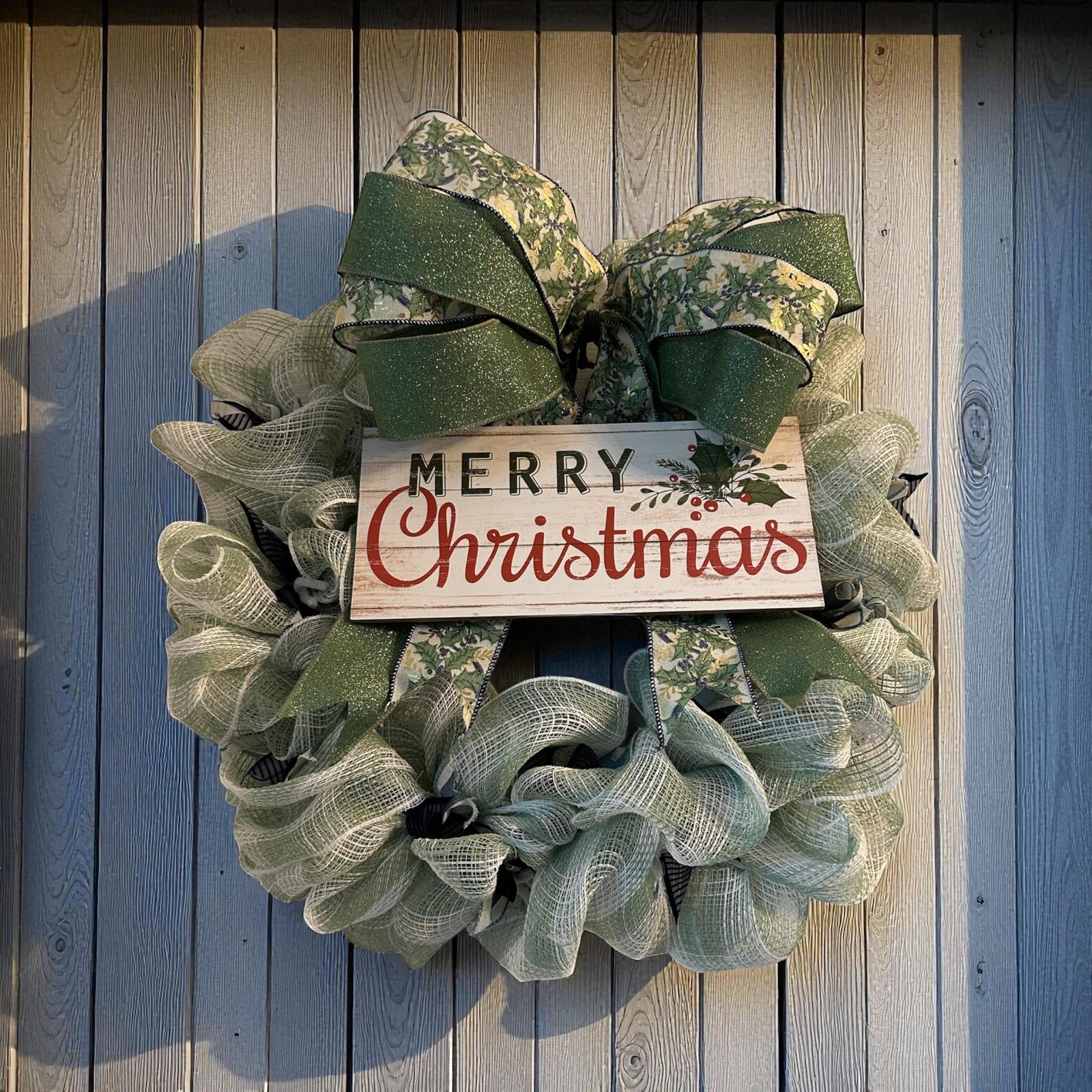 Built on a sturdy 18-inch wire frame and fluffed to approximately 20 inches, this wreath is full and textured, featuring layers of soft mesh burlap ribbon that hold their shape beautifully. The centerpiece is a wooden “Merry Christmas” sign adorned with holly accents, surrounded by loops of green glitter ribbon and holly-print wired bows that add just the right touch of festive sparkle.