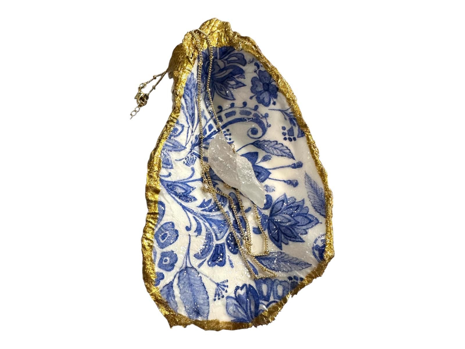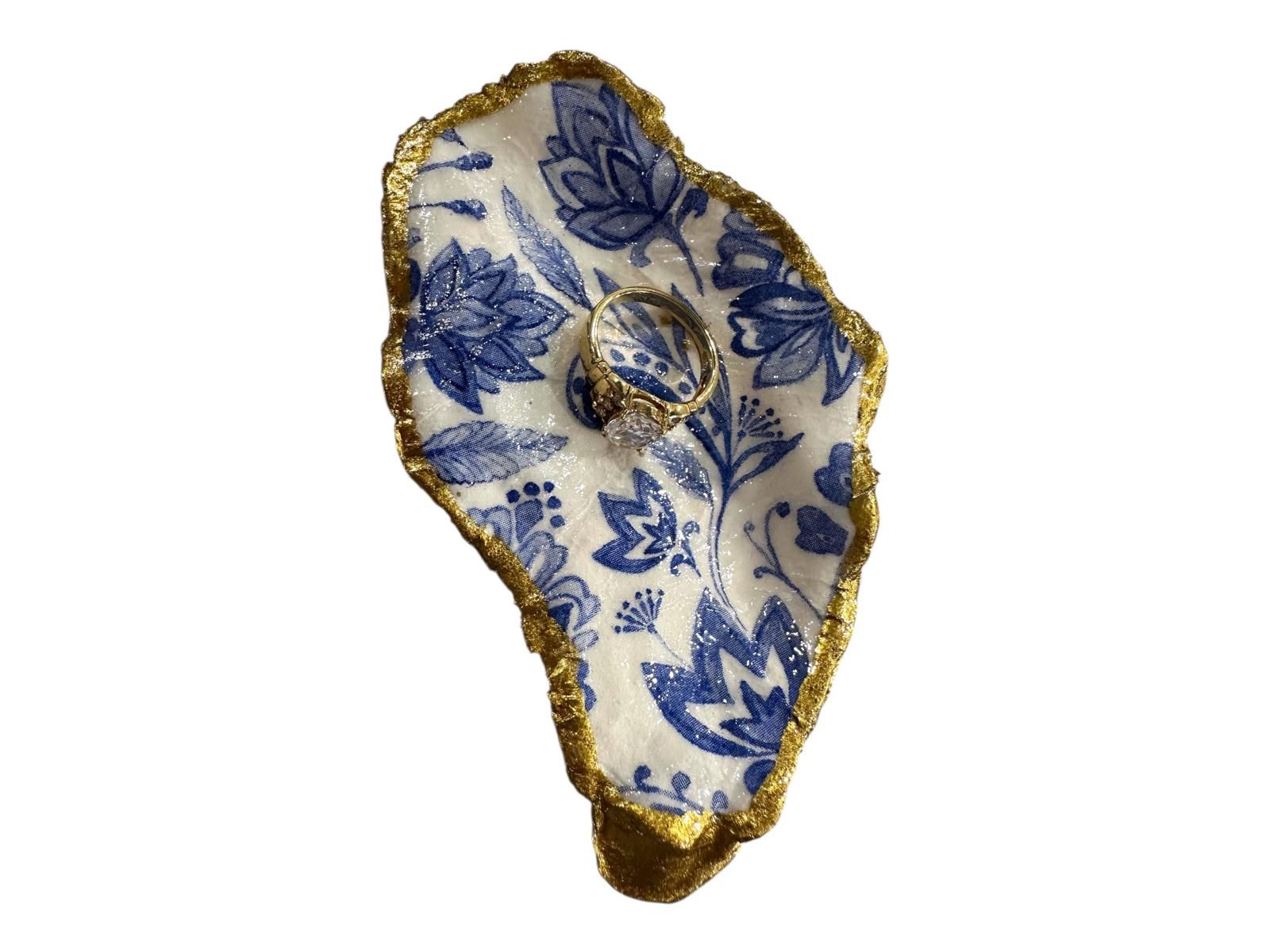Bring timeless elegance to your vanity or bedside table! This handmade oyster shell ring dish features a classic blue-and-white design, delicately decoupaged inside the natural shell and finished with a hand-applied gold gilded edge. Inspired by the “something blue” tradition, it’s a meaningful and beautiful keepsake for weddings, anniversaries, or everyday elegance.