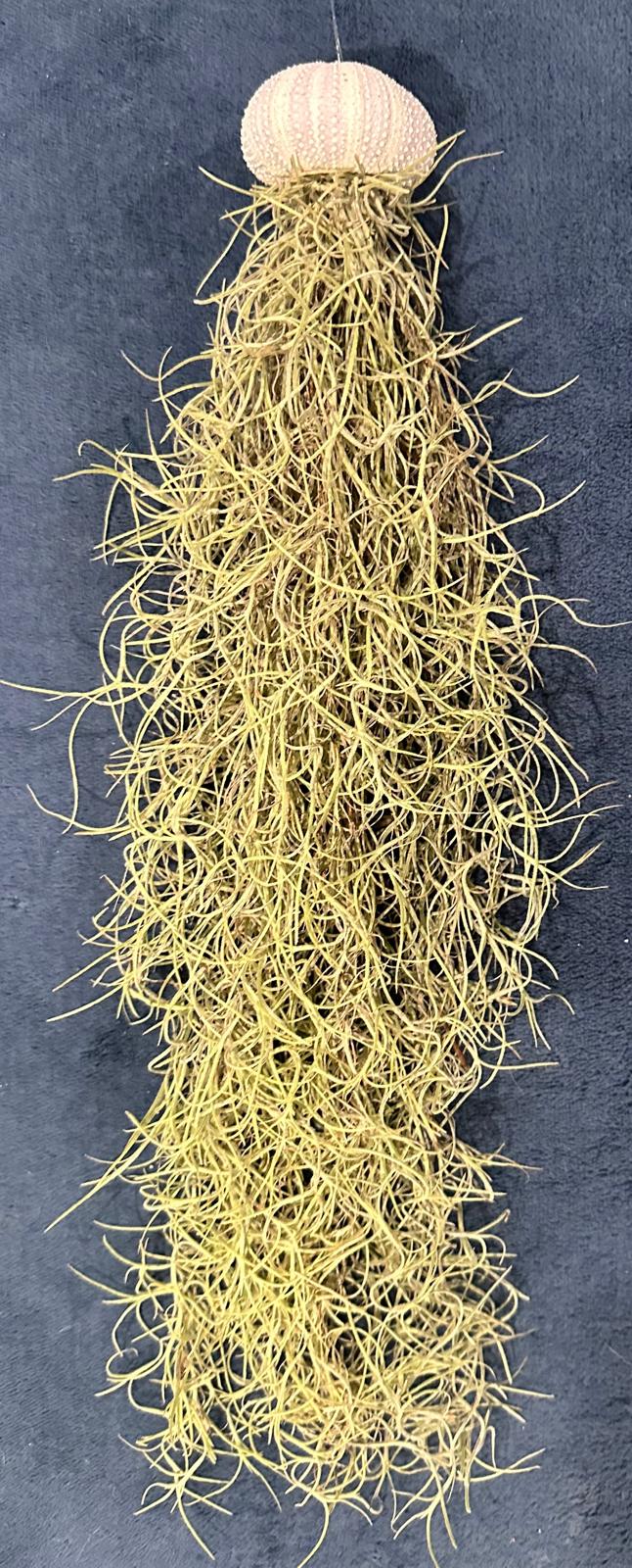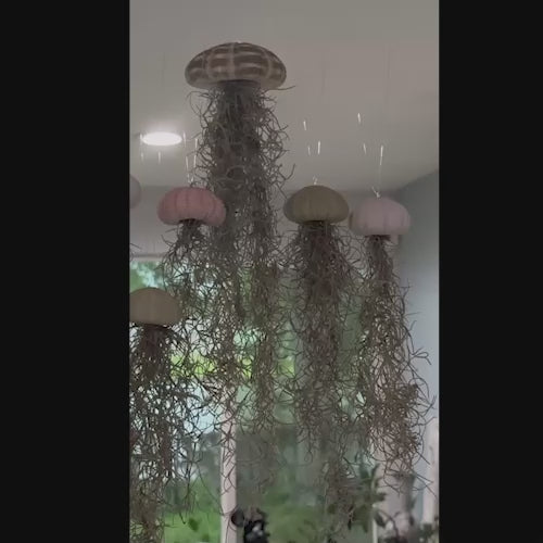 Bring the calm of the coast to your home with this Set of 3 Coastal Jellyfish Ornaments, handcrafted with live Spanish moss and authentic sea urchin shells in soft tones of white, green, and purple. Suspended with clear fishing line, each piece mimics the gentle movement of a jellyfish, making them a perfect accent for windows, bathrooms, porches, or beach-themed displays.